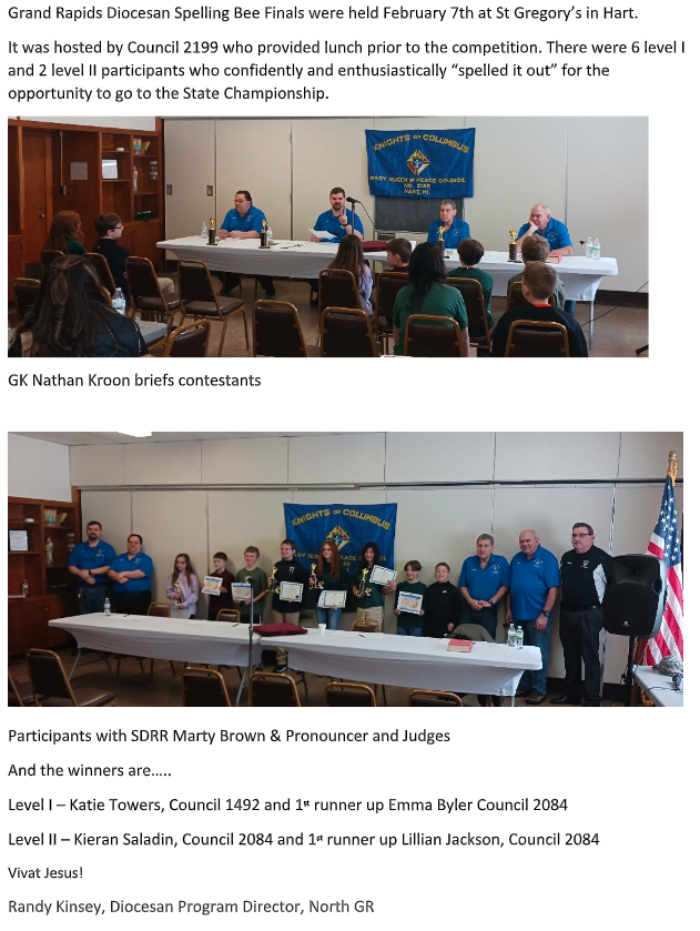 Au Lac Council 10724 hosted a pizza dinner for the July-December 2025 Youth of the Month Award winners on January 30th. Fr. Joseph Esper gave a blessing to the winners and their families before dinner. DGK/PD Brian Webster shared the history of the program which started in January 2023. Since then the council has honored over 36 youths in grades 3-12 for demonstrating their Catholic faith through service to their school, church and communities.