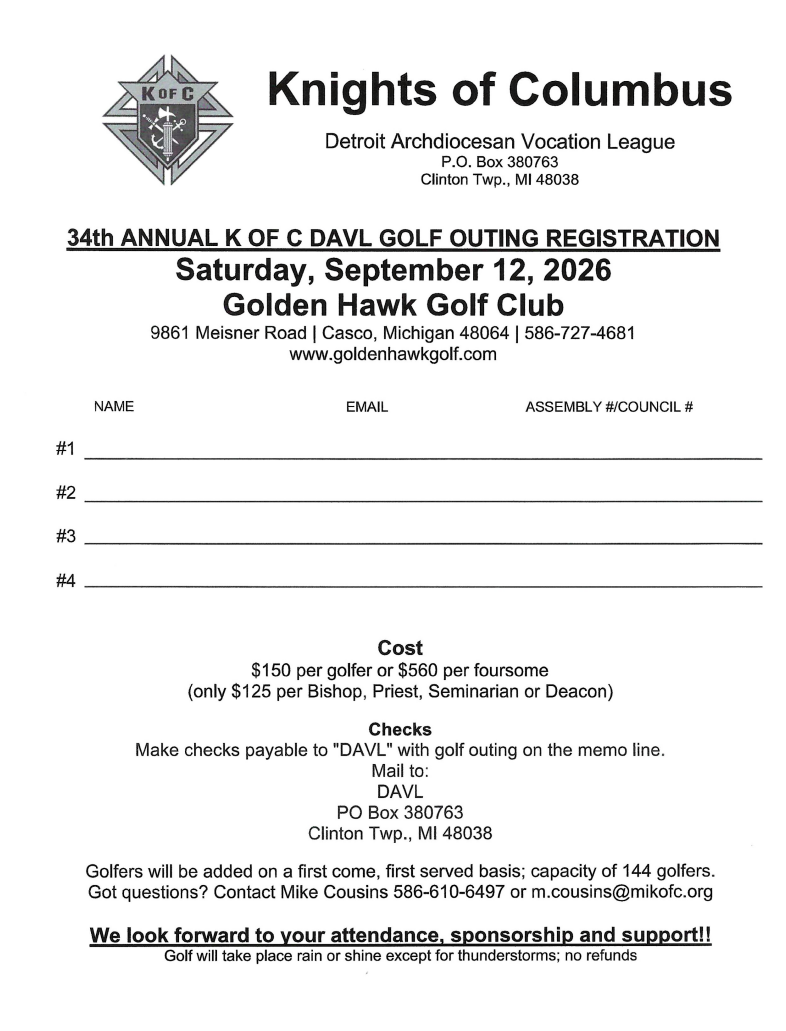 Wasmund, Administrative Secretary to the State Deputy at (734) 634-7989 or