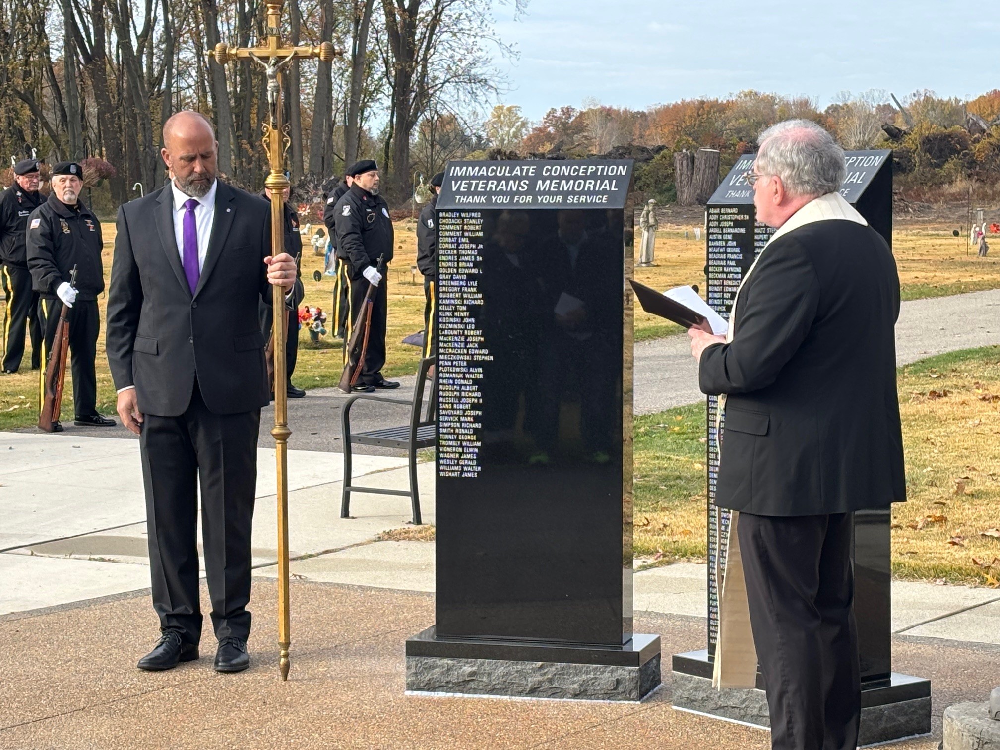 Au Lac Council 10724 in Ira Township held a dedication ceremony on November 1st for their second Veterans Memorial Monument stone. Approximately 80 people attended the ceremony including Fr. Joseph Esper, Pastor of Immaculate Conception Parish, K of C Color Guard, VFW Post 7573 Color Guard, members of Au Lac Council 10724 and St. Mary of the Lake Assembly 2804, and family members.