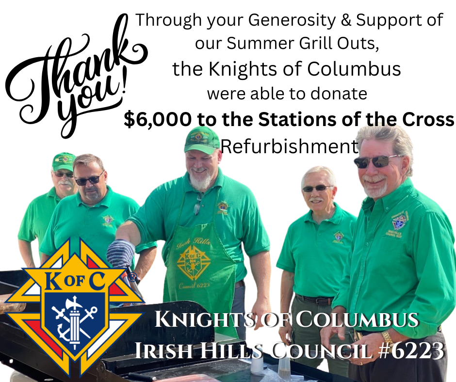 This summer, Irish Hills Council 6223 held a monthly grillout to support our historic Stations of the Cross at St. Joseph Shrine. We grilled burgers, brats, and hotdogs on the last Sunday of the month all summer long. Our DGK Mike Kimutis gave a talk prior to each Mass and we accepted free will donations. At the end of the summer we were able to present a check to the Parish for $6000.
