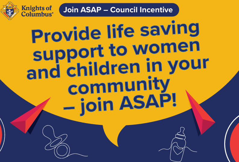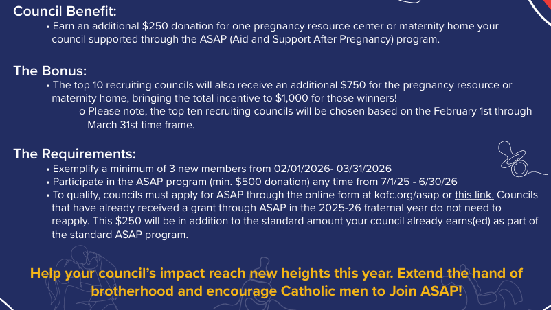 Councils that recruit 3 members between February 1 and March 31 AND donate at least $500 through the ASAP program any time during the 2025-26 fraternal year will receive an additional $250 for the pregnancy resource center or maternity home they supported.