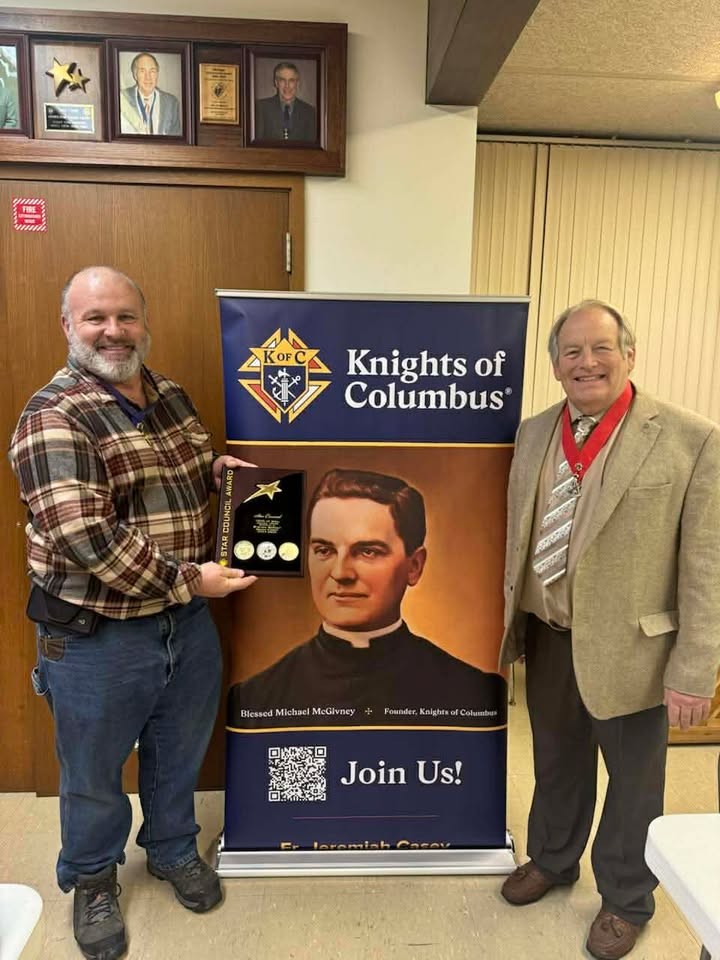 District Deputy Roger Markham awarded the Star Council Award to Grand Knight Don Claeys at the end of Mass on Sunday, January 11. Parish Pastor and former Diocesan Chaplain Fr. Matthew Wigton was on hand for the ceremony, which was also attended by the Color Corps of Gaylord Assembly 1718 led by Commander Michael Rola.